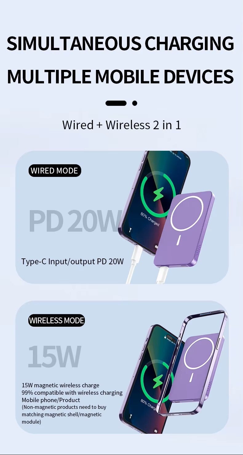 Geef je telefoon supersnelle stroom met deze ultradunne magnetische power bank! Perfect voor de iPhone 16, 15, Samsung en andere Qi-compatibele toestellen. Met 5000mAh capaciteit, draadloos opladen (tot 15W) en een handig LED-lampje, is deze power bank ideaal voor onderweg, op reis of dagelijks gebruik.